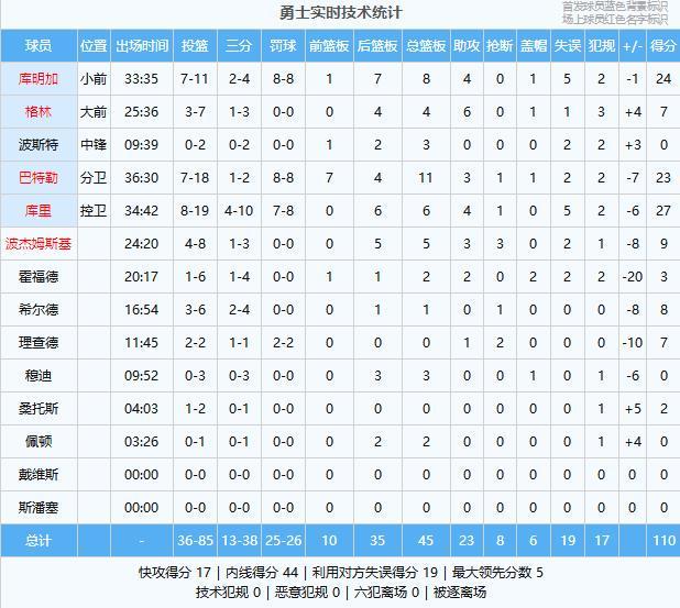 勇士:库里27分6板4助、库明加24分8板4助、巴特勒23分11板3助、波杰姆斯基9分5板3助3断、希尔德8分1板、格林7分4板6助、理查德7分1助2断、霍福德3分2板2助2帽、桑托斯2分、波斯特3板、穆迪3板、佩顿2板