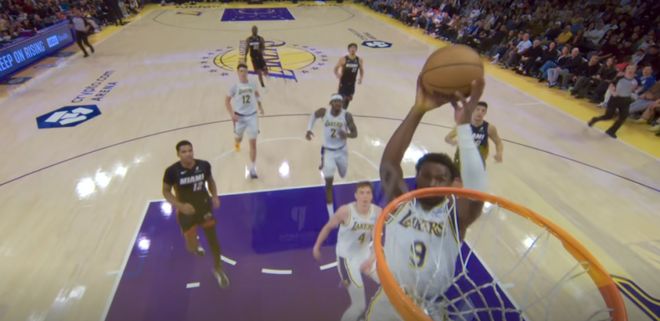 而且最重要的不光是这个小阵容,布朗尼还完成了他非常精彩的进球,就算只有一个球也够了,当时我们看得很清楚,反击当中,里夫斯运球布朗尼急速跟进,湖人这是一次快攻,所以热火队的防守已经来不及了。此时里夫斯吸引了所有人防守之后把球高高抛起,布朗尼从左侧切入,双手接球完成了一次滑翔空接暴扣,他起跳高度极高,已经直接平框了。