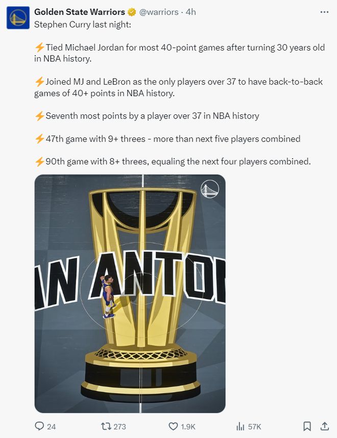 勇士官方也晒出库里创造多项纪录: