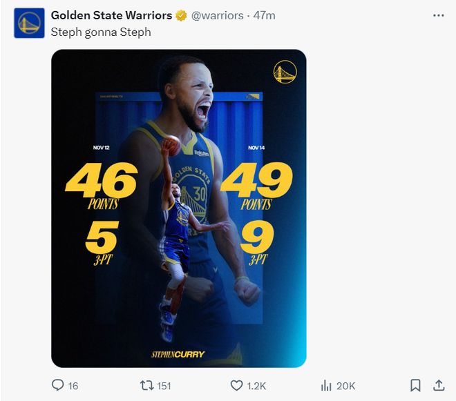 勇士官方晒库里95分!创13纪录被赞GOAT 科尔直言不断带来惊喜