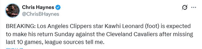 北京时间11月23日,据名记Chris Haynes报道,快船队前锋科怀-莱昂纳德预计将在周一(北京时间)对阵克利夫兰骑士队的比赛中复出。