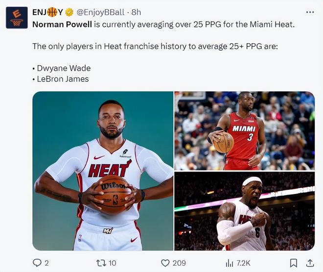 美媒写道:热火队史只有詹姆斯、韦德赛季平均达到过25分,目前鲍威尔场均超过25分,他有希望成为热火队史第三人。
